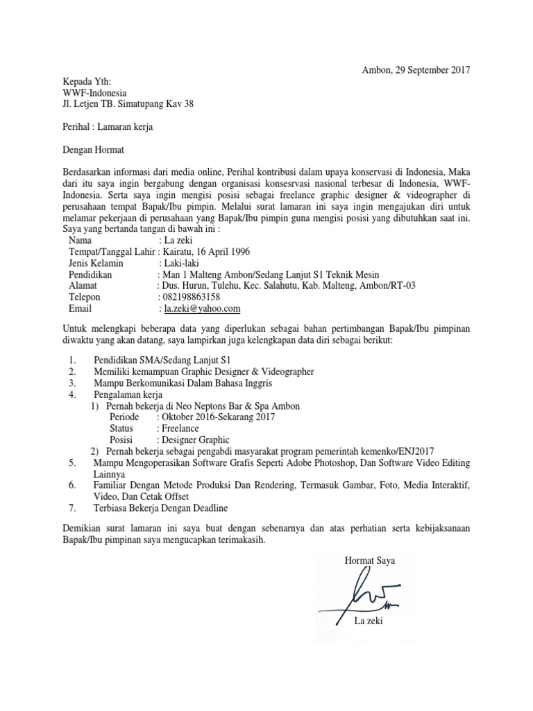Dilengkapi file doc dan tips agar diterima! Salah satu syarat yang diwajibkan perusahaan atau pemberi kerja adalah surat lamaran kerja. Contoh surat lamaran kerja sebagai security. Membuat surat lamaran kerja memang terlihat gampang. Jika anda membutukan contoh surat lamaran kerja umum, anda bisa coba baca beberapa referensi yang telah kami buat dari text dan dengan gambar. Contoh surat lamaran kerja yang berformat doc dan juga pdf bisa dikirimkan lewat email seperti surat lamaran kerja guru, bank ataupun bahasa inggris. Dan berikut kami akan memberikan contoh surat lamaran kerja lengkap. Pada surat tersebut, perekrut akan melihat biodata lengkap dari pelamar dan melihat ketepatan struktur penulisan surat lamaran kerja. Hal ini dapat menjadi nilai plus bagi anda. Mulai dari tata bahasa, format penulisan, hingga isi keseluruhan surat lamaran tersebut. Surat lamaran kerja cpns harus diperhatikan dengan baik, pastikan untuk melakukan cek ulang sebelum upload atau mengirimkannya. Berikut contoh surat lamaran kerja untuk fresh graduate setingkat sma dan smk yang baik dan benar sesuai dengan syarat dan tanggal surat tanggal surat tentunya juga sangat penting dalam penulisan lamaran kerja karena akan mengetahui surat tersebut. Kepala personalia nusa dua beach hotel & spa denpasar bali.