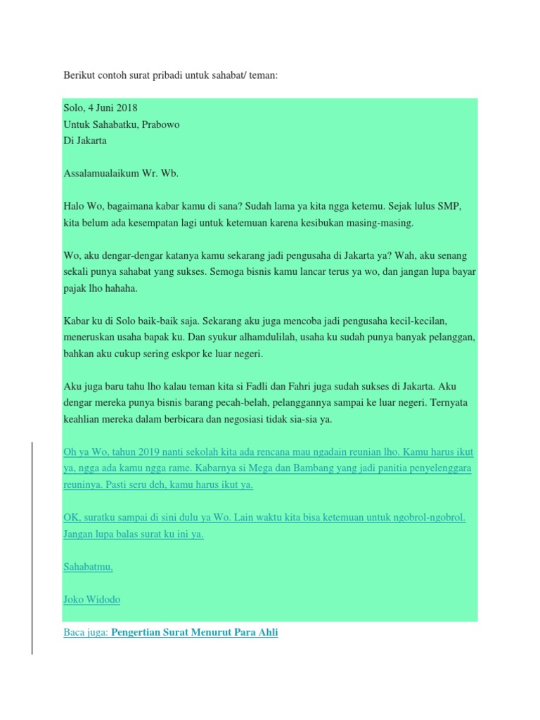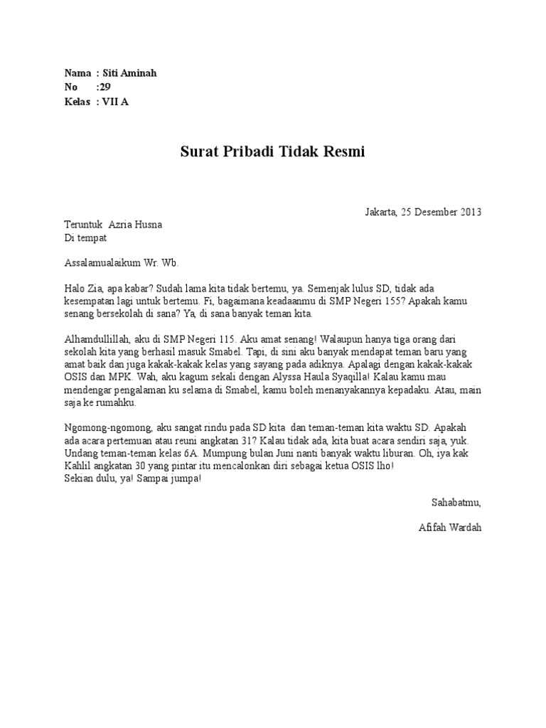 Dicky, aku dapat kabar soal kesehatanmu. Tujuan yang lainnya membuat surat pribadi yaitu untuk mengekspresikan suatu perasaan si penulis dalam. Aku bukan saja sudah besar. Surat pribadi atau personal letter adalah surat yang dibuat oleh perseorangan/individu yang ditujukan untuk pihak tertentu. Dewi, aku ingin sekali loh bertemu sama kamu. Sedih mendengar kamu kena demam berdarah dan harus masuk rumah sakit. Jika teman anda pindah sekolah bukan berarti pertemanan atau persahabatan yang kalian bina akan terbengkalai begitu saja. Semenjak saat itu saya tidak sempat lagi mendengar berita tentangmu lagi sahabatku. Pada kesempatan kali ini saya akan membagikan cara menulis surat pribadi yang ditujukan kepada teman atau sahabat. Akan tetapi, berbeda dengan era sekarang ini yang sudah serba canggih. Contoh surat pribadi dalam bahasa inggris lengkap dengan artinya ~ dalam proses berkirim surat mungkin suatu saat sahabat semua ingin mengirim surat ke teman kalian di luar negeri atau mengirim ke teman baru yang kebetulan adalah orang london, yang kalian temui kemudian kenalan di hotel misalnya.nah memang dalam jaman saat ini proses berkirim surat adalah hal yang sangat jarang dilakukan orang. Kita terakhir bertemu saat masih baru tamat smp dan kami sekeluarga harus pindah ke medan karena ayah pindah tugas. Surat pribadi disampaikan oleh seseorang dan ditujukan untuk perseorangan dan memang bersifat pribadi.